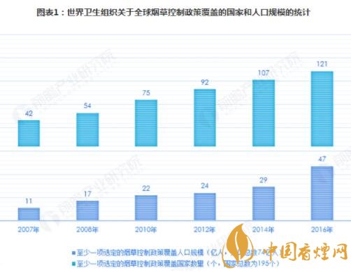 世界衛(wèi)生組織(World Health Organization,簡稱WHO)發(fā)布的主題為監(jiān)測煙草使用與預(yù)防政策《2017年全球煙草流行報告》顯示,當(dāng)前全球控?zé)熣叩母采w面繼續(xù)擴大,全球共有121個國家共47億人口(全球近三分之二的人口)受到控?zé)熣叩挠绊懀壳叭杂?4個國家共27億人未受到控?zé)熣叩母采w。此外,雖然部分國家和地區(qū)的卷煙消費量有所下滑,全球卷煙消費的增速放緩,但全球吸煙人口數(shù)量仍在不斷增加。