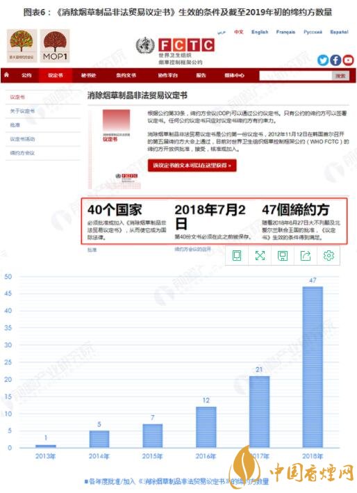 世界衛(wèi)生組織還積極推動《消除煙草制品非法貿(mào)易議定書》簽訂生效。按照2012年通過該議定書時的約定,《議定書》需要40個締約方可生效,《議定書》將在第40份文書被保存后第90天起生效。根據(jù)世界衛(wèi)生組織煙草控制框架公約發(fā)布的情況,隨著2018年6月27日大不列顛及北愛爾蘭聯(lián)合王國的批準(zhǔn),《議定書》生效的條件得到滿足。目前,議定書締約方數(shù)量已經(jīng)達到47個。