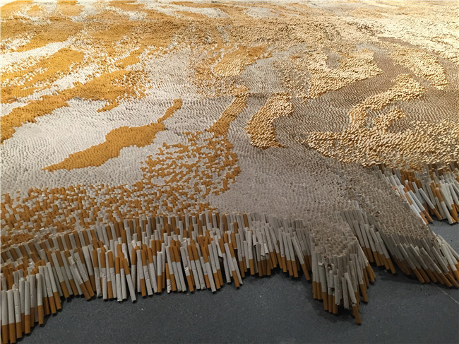 這件巨大而厚實的“虎皮地毯”鋪陳,是由50萬支重達440磅的香煙按照特殊的排列組成的驚人之作。為了突出全球貿易、包裝和人們是如何被致命的吸煙習慣所誘惑,56歲的徐冰經過十年探索花上十年的時間去制作……,最終創作出此作品。