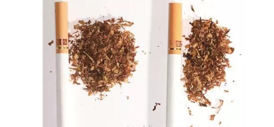 假煙煙支過濾嘴較短,長度約為20mm,制絲工藝粗糙,色澤發暗無光澤、煙絲中含碎末較多,大量梗絲未經過膨脹處理,無造紙法再造煙葉,與真品特征存在明顯差異。