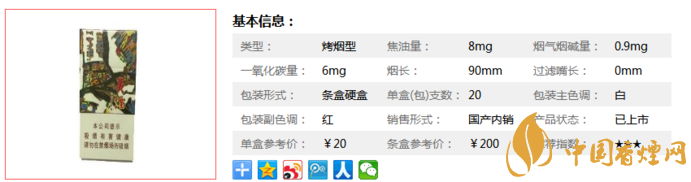 | 類型 :烤煙型 | 焦油量 :8mg | 煙氣煙堿量 :0.9mg | 一氧化碳量 :6mg |