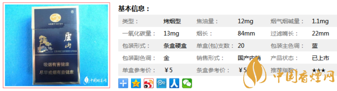 | 類型 :烤煙型 | 焦油量 :12mg | 煙氣煙堿量 :1.1mg | 一氧化碳量 :13mg |