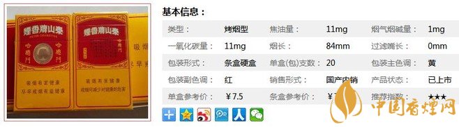類型 :烤煙型 焦油量 :11mg 煙氣煙堿量 :1mg 一氧化碳量 :11mg