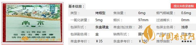 | 類型 :烤煙型 | 焦油量 :6mg | 煙氣煙堿量 :0.6mg | 一氧化碳量 :5mg |