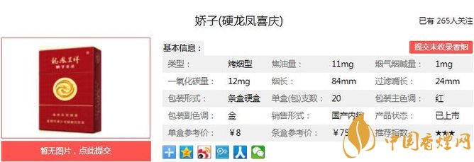 煙支長84mm,過濾嘴長24mm,龍鳳呈祥精品生產線,28個環節精密檢測品質保障,彰顯自然時尚清新的魅力。下面我們一起來看嬌子硬龍鳳喜慶的參數信息:焦油量:11mg 煙堿量:1.0mg 一氧化碳量:12mg