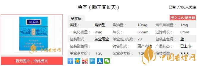 金圣(滕王閣長天)命名來源于《滕王閣序》:“落霞與孤鶩齊飛,秋水共長天一色”。目前我所知道的滕王閣系列,大概有10種。其中,粗支規格(煙支長度84mm及以下)7種、細支規格2種,中支規格1種。文中的長天,就屬于中支規格。下面就由香煙網小編帶大家一起來了解金圣(滕王閣長天)的相關信息。