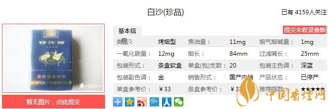 香氣更醇和、更飽滿,余味更足,口味在精品二代的基礎上進一步提升。包裝采用華貴藍,配以鐳射煙標及精美壓紋,盡顯產品尊貴特質。藍色的煙嘴,特別顯高檔,能顯示男人器宇不凡的個性,可以顯示主人的身份及地位。經香煙網小編市場調查白沙珍品售價為33元/包。