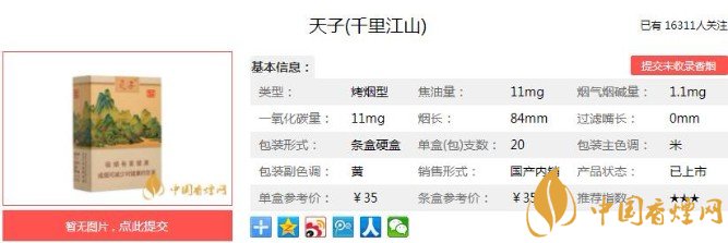 天子(千里江山)以重慶武陵生態地區優質煙葉為原料,匯聚綜合降焦與減害技術等集成應用,在降低有害氣體同時使煙氣更加清香雅致。下面便是天子(千里江山)的基本參數:焦油量:11mg 煙堿量:1.1mg 一氧化碳量:11mg.