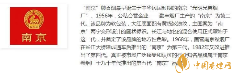 1995年,1995年南京品牌卷煙銷量為2.3萬箱。“南京”被評為“江蘇五大名煙”,與具有自主知識產(chǎn)權(quán)的低焦油“夢都”一起成為南京卷煙廠步入跨躍式發(fā)展之路的兩艘巨輪。