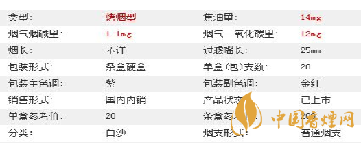| 類型 :烤煙型 | 焦油量 :14mg | 煙氣煙堿量 :1.1mg | 一氧化碳量 :12mg |