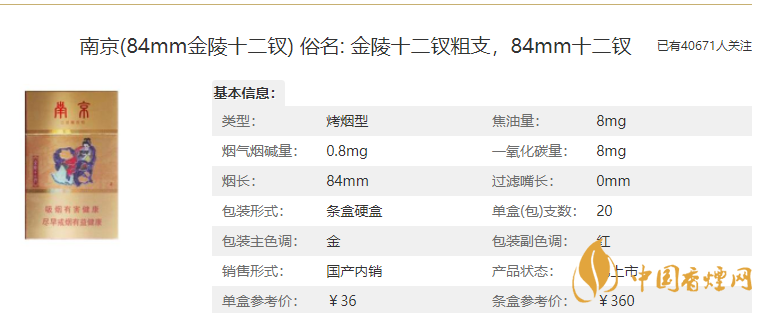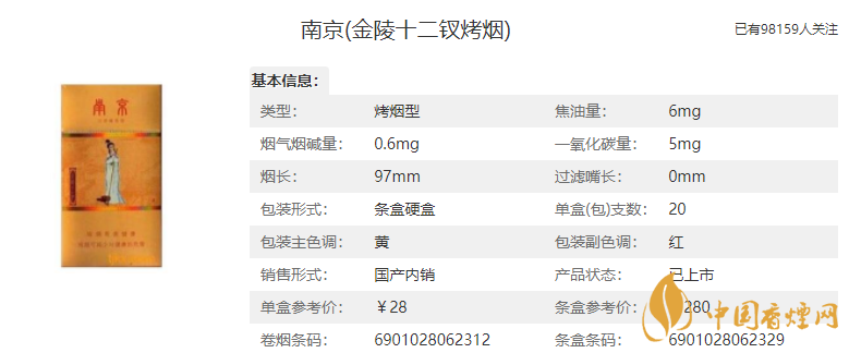 價格:28元/包,這款南京(金陵十二釵烤煙)是金色的包裝,這也是銷量最好的一款香煙,這款香煙是細支香煙,柔和但煙氣飽滿純正,沒有其他細支寡淡的感覺。6mg的焦油含量屬于低焦香煙。