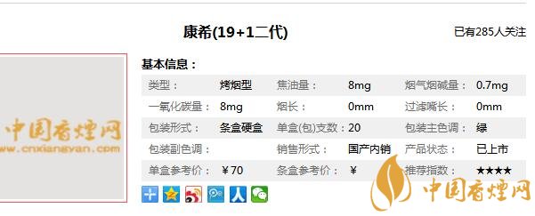 康希香煙是我國早期使用的科技降害典范香煙,這款康希一(19+1),現如今也是退出市場了,但是這款香煙也是作為中國煙草技術進步的一個開始,那么康希香煙多少錢一包,現在就由香煙網小編為大家介紹一下康希香煙價格圖片。