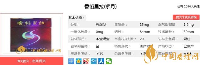 香格里拉紫月用料考究,加工精細(xì)品質(zhì)出眾,是昆煙繼云煙珍品之后推出的又一高品質(zhì)產(chǎn)品。這款煙包裝漂亮,煙氣醇厚、本香十足,給力的15焦給人較強(qiáng)的滿足感,但煙氣的順滑度較差,入口有辣感,目前已經(jīng)停產(chǎn)下市。經(jīng)香煙網(wǎng)小編市場調(diào)查香格里拉紫月售價(jià)為30元/包。