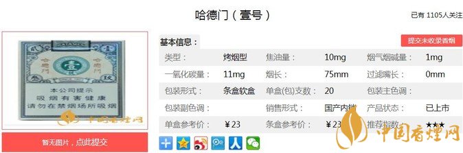 山東中煙是一個(gè)飽含人文情懷的企業(yè),哈德門(壹號)穿越歷史煙云,尋覓最初的味道,致敬一段歷史,致敬一段情懷,重新上市。經(jīng)小編市場調(diào)查哈德門(壹號)售價(jià)為23元/包。