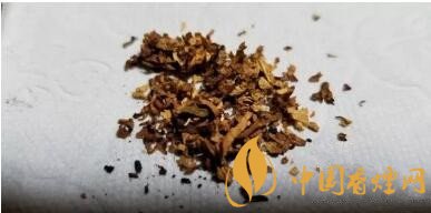 攤開煙絲,明黃的烤煙和暗棕的晾煙比例基本接近1:1。有切得很細(xì)碎的煙梗交雜其間??緹煴壤饶β甯绨姹疽愿咭恍?。
