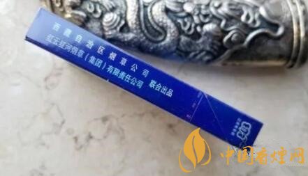 煙盒正反版面一樣,上蓋位置有雪峰日照金山,彌漫的云霧拱衛金頂。只是細支的這個圖片質量不太理想。煙盒的中部是金色藏文書寫風格的“雪域”字樣。居中,有藍色的蓮花座圖案。下有銀色小字——西藏自治區煙草公司總經銷。