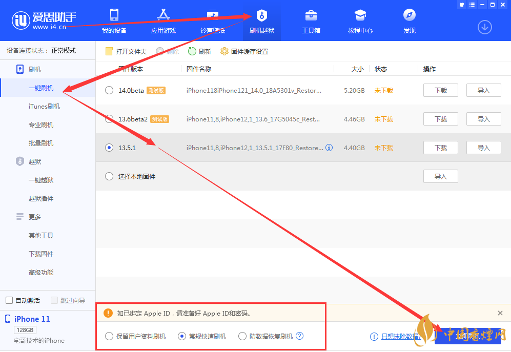 3.確認(rèn)數(shù)據(jù)備份成功之后,點(diǎn)擊上方“刷機(jī)越獄”進(jìn)入到“一鍵刷機(jī)”界面,選擇 iOS 13.5.1,勾選“常規(guī)快速刷機(jī)”,然后點(diǎn)“立即刷機(jī)”,之后愛思助手會自動幫您下載固件并刷機(jī)。