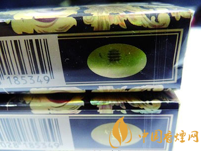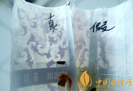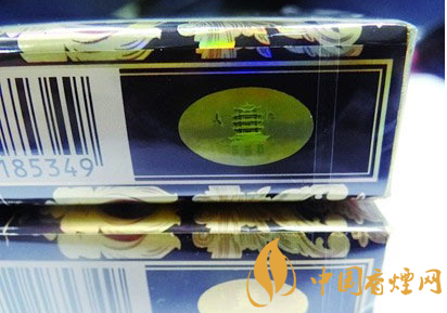 真品小盒正反面均采用具有黃色、紅色、紫色、藍色和綠色等干涉色的效果珠光油墨,在不同光線角度下會呈現出不同顏色,同時也具有能阻止掃描儀、電分機及彩色復印機的復制功能;假煙在不同光線角度無法呈現出彩色光線變化,因多采用高清掃描復制,其圖片多邊緣呈現顆粒粗大的網格狀,與真品材質存在顯著差異。