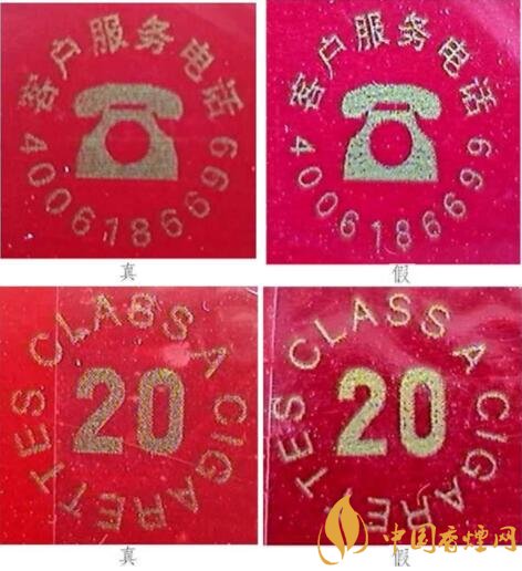真煙的“ 電話”和“20”標(biāo)識(shí)呈現(xiàn)布紋狀;假煙的“電話”和“20”標(biāo)識(shí)中沒有紋路,且有漏金。