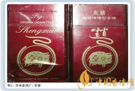山東濟南卷煙廠曾出品過采用中國民間傳統的剪紙手法設計,底色為紅色的 “亥豬”煙標。圖案上是一頭肥嘟嘟的花豬形象,其短小的四肢似乎支撐不了它的重量,兩只豎立的耳朵和張開的小嘴,表明它正在尋找食物,看上去十分溫馴、可愛。