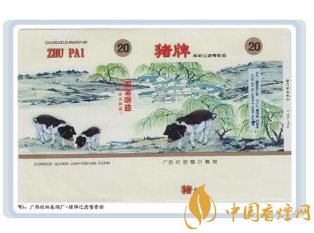 廣西桂林卷煙廠生產過一款豬牌煙標,圖案是三頭花豬正在春風柳綠的村莊外的山地上覓食,包裝上對焦油量、煙氣煙堿量有明確的標識?! ?/p>