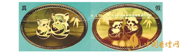 正面文字差異對比:真煙“小熊貓”字樣字體較粗,字形渾厚有力,凸起明顯,燙金緊湊均勻;假煙“小熊貓”字樣字體較細,似連似斷,凸起不明顯,邊緣燙金較寬。